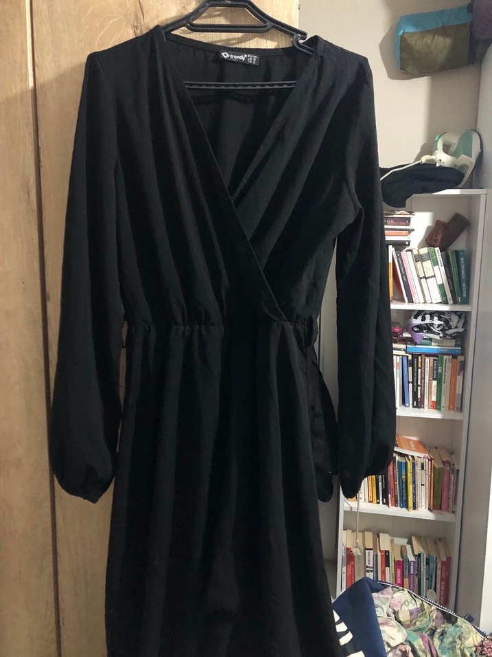 Uzun kollu, siyah midi boyunda, bol kesim gotik tarzda, desensiz kadın elbisesi. Karanlık ve şık görünüm için uygun.
