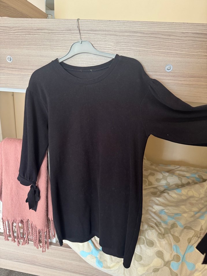 Siyah keten kumaştan, uzun kollu ve bağcıklı manşetlere sahip midi boy, salaş kesim kadın elbise. Günlük kullanıma uygun, sade ve şık görünüm sunar. Çizme ile kemer ile vs cok güzel kombinler yapılıyor. 2 3 kez giyildi