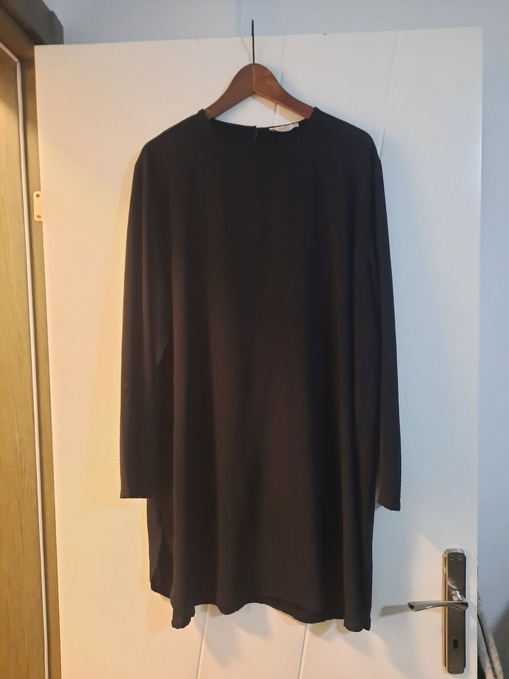 Siyah renkte, uzun kollu, midi boyda, bol kesim kadın tunik. Yuvarlak yakalı ve dökümlü tasarıma sahip, ayrobin kumaştan üretilmiştir.