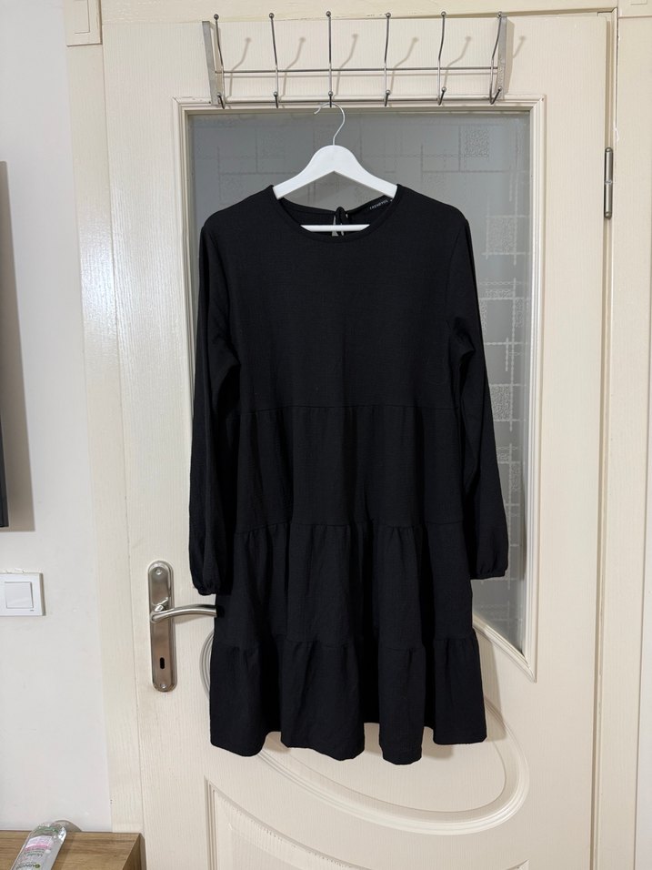 Rahat kesim, uzun kollu ve yuvarlak yakalı siyah midi elbise. Yumuşak keten kumaştan, katlı ve fırfırlı detaylı minimal goth tarzı.