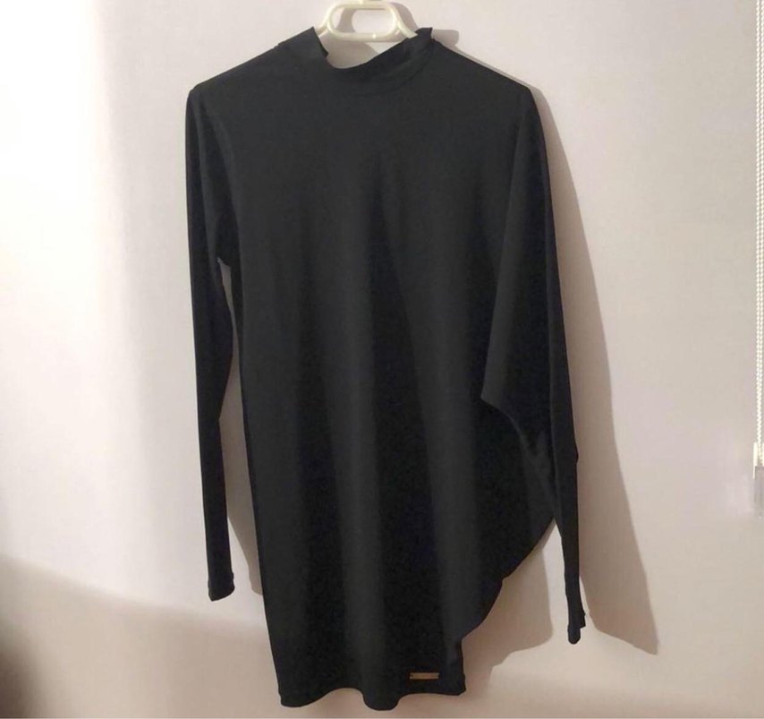 Uzun kollu, yüksek yakalı ve drapeli siyah midi tunik. Sentetik kumaştan, bol kesimle günlük kullanıma uygun.