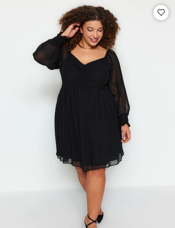 Siyah midi elbise, uzun tül kollar, V yaka ve hafif bağlama desenli, bol ve drapeli kesime sahiptir. Romantik akşamlar için uygundur.
