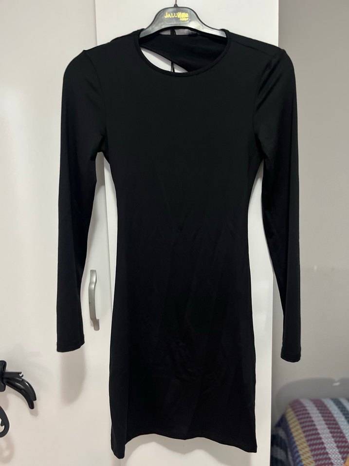 Siyah, uzun kollu, sırt dekolteli,midi boy elbise. Düz, dar kesim ve yuvarlak yaka ile sade ve şık bir görünüm sunar. Yumuşak sentetik kumaştan yapılmıştır.
