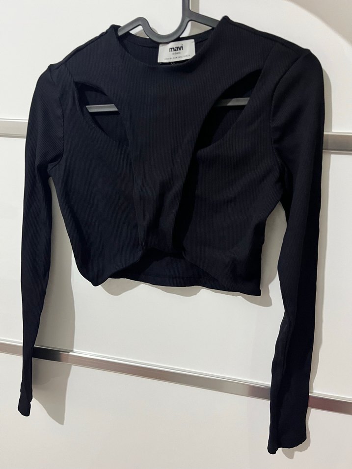 Bu siyah, uzun kollu ve dar kesim bluz, yuvarlak yaka ve yandan yırtmaç detayına sahip, sentetik kumaştan üretilmiştir.