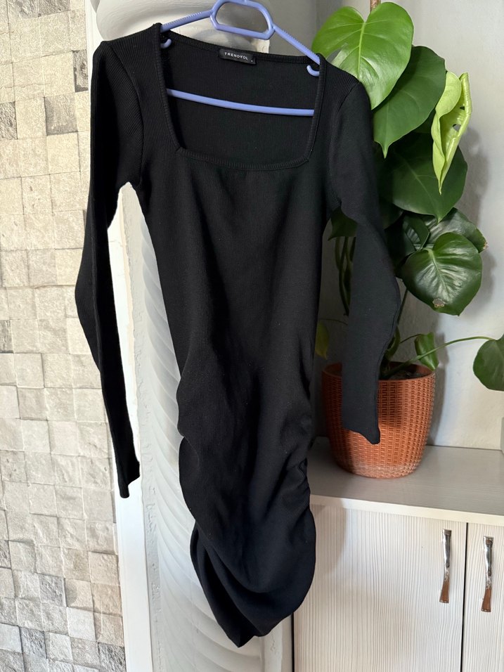 Siyah, uzun kollu, kare yaka elbise.Yumuşak sentetik kumaştan, drapeli ve mini boydadır. Günlük kullanım için uygundur.