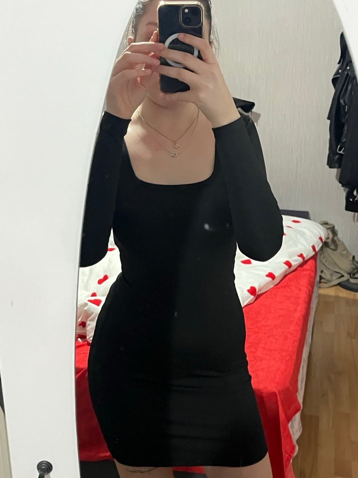 Siyah, uzun kollu, kare yaka mini elbise, ipeksi kumaştan ve vücuda oturan kesimle romantik akşamlar için ideal. Butik ürünü. Hiç giyilmedi.