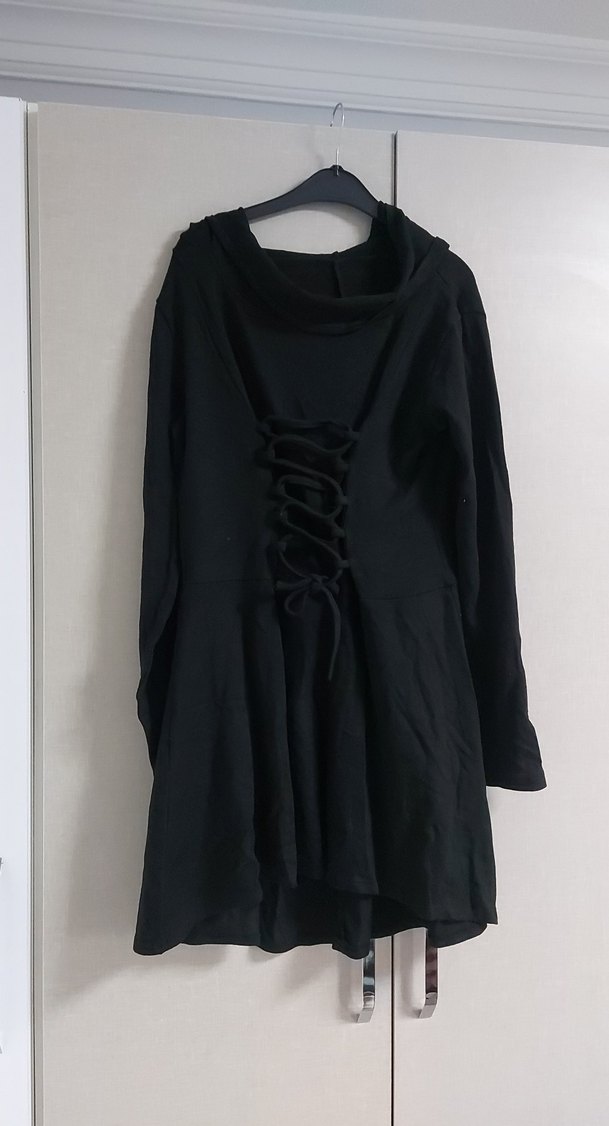 Siyah renkli, keten kumaştan uzun kollu, yüksek yakalı ve bol kesim midi örgü elbisedir. Bel kısmında bağcıklı drapeli detay bulunur.