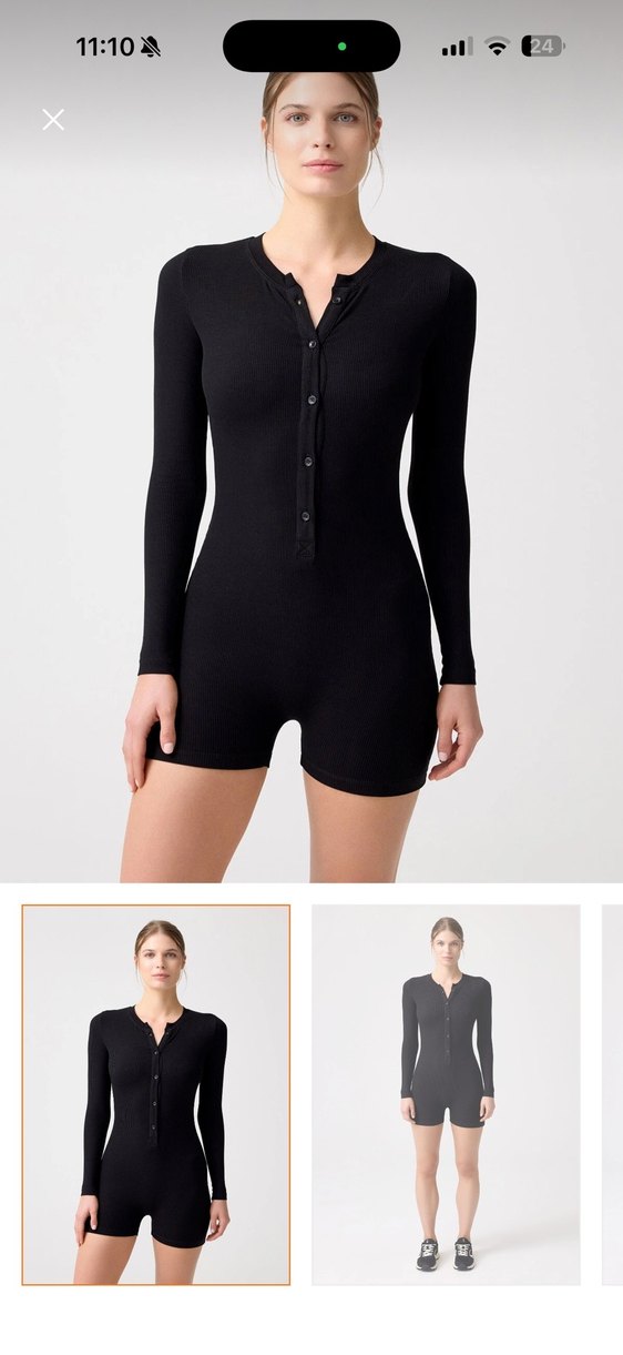 Dar kesim siyah tulum, uzun kollu ve yuvarlak yakalıdır. Pürüzsüz sentetik kumaştan yapılmıştır ve kısa boyuyla günlük kullanıma uygundur.