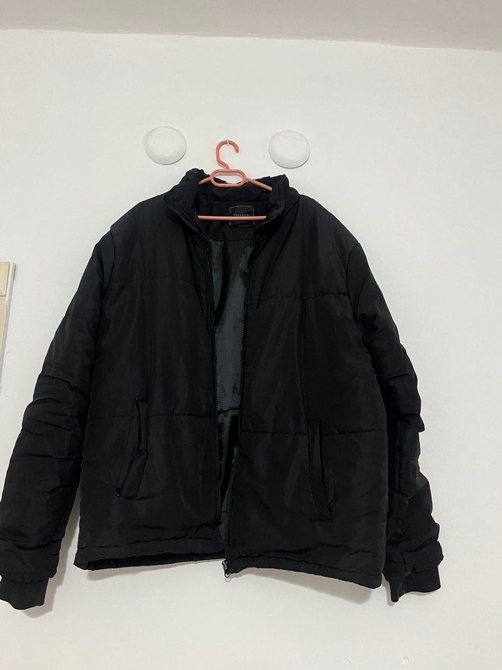 Siyah, uzun kollu ve yüksek yakalı, yumuşak ve sıcak kumaştan yapılmış, sade ve desen içermeyen minimalist stil kadın ceketi.