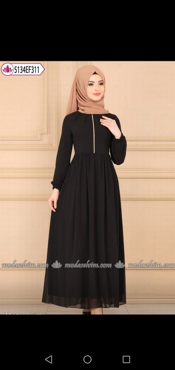 Siyah renk, uzun kollu, fermuarlı ön detaylı, bol kesim, düz desenli, sentetik kumaştan modern klasik uzun elbise.