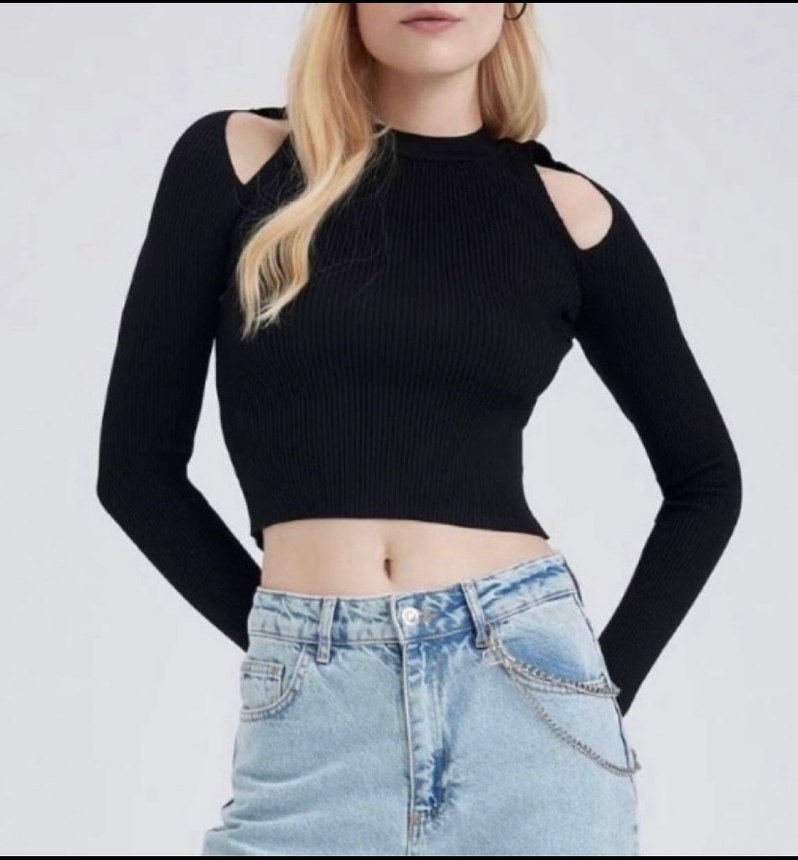 Bu siyah, uzun kollu crop top, bisiklet yaka ve omuz açık detayıyla, trend sokak stili sunar. Günlük kullanıma uygundur. Etiketli üründür hediye paketiyle gönderilir