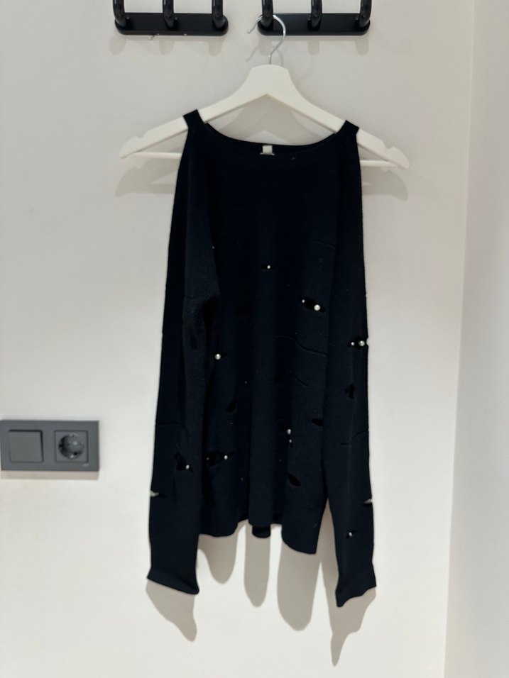Uzun kollu, yuvarlak yaka, bol kesim siyah omuzları açık örgü kazak, gündelik kullanım için uygun sade ve koyu renkte.