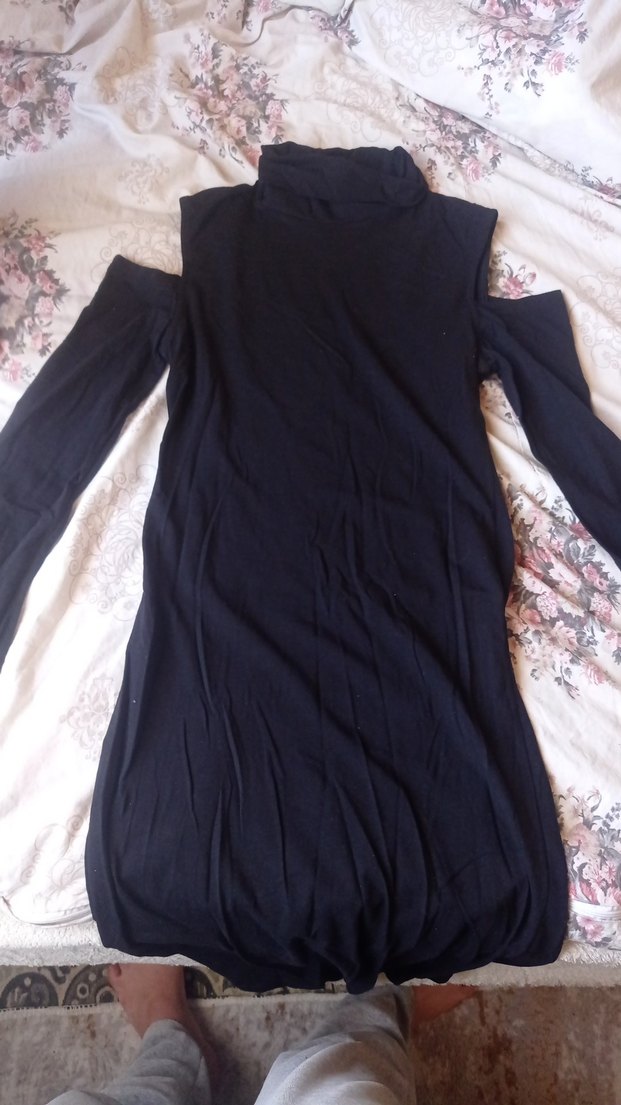 Uzun kollu, omuzları açık, yüksek yakalı ve vücuda oturan midi elbise. Pürüzsüz sentetik kumaştan, gotik tarzda romantik anlar için uygun.