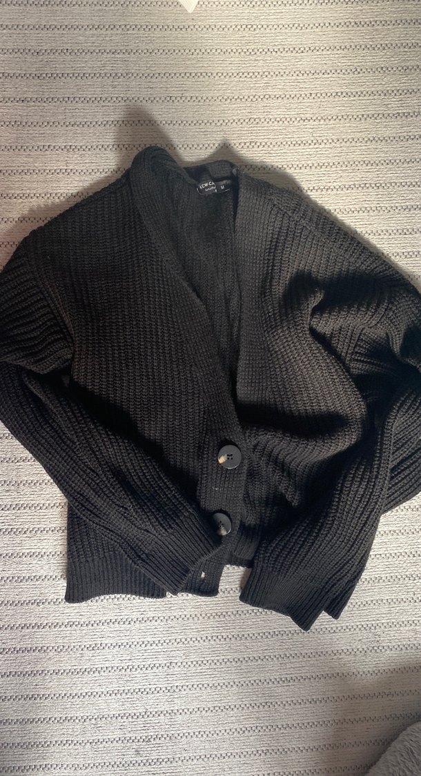 Bu siyah örgü hırka, uzun kollu ve çıtçıtlı, rahat kesim ve normal boyda. Günlük kullanıma uygun, konforlu ve şık bir parça.