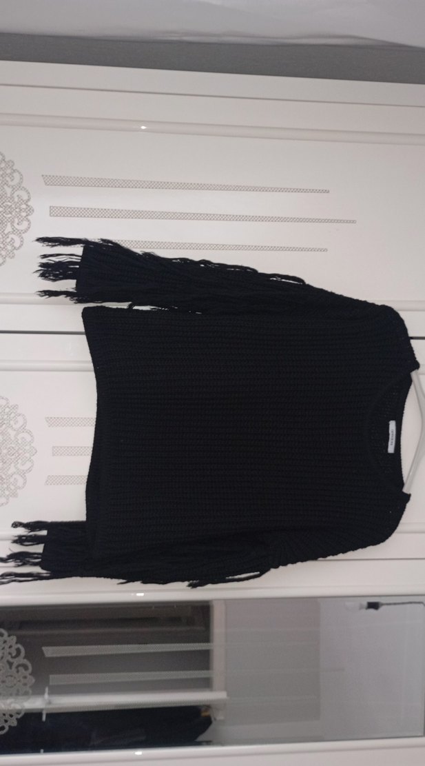 Siyah, uzun kollu, örgü kadın kazak; bol kesim ve uzun boy. Kayık yaka ve püskül detaylarıyla rahat ve gotik tarzda, günlük kullanıma uygun. beden standart m l ye olur
