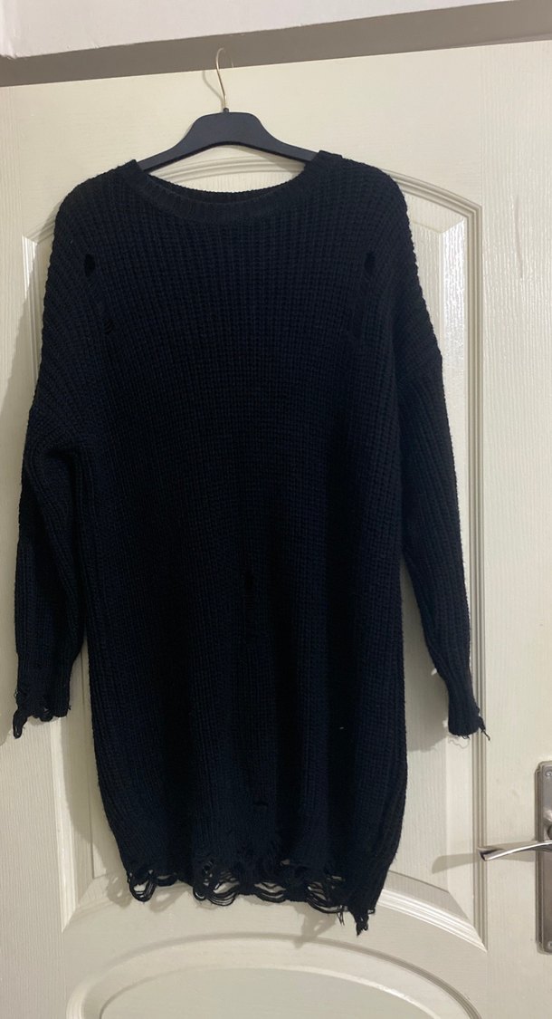 Siyah, uzun kollu ve bol kesim kadın kazağı, örgü kumaştan yapılmıştır. Düz ve gotik tarzda, rahat kullanım için uygundur. Yırtık modelleri vardır kolunda ve etek ucunda