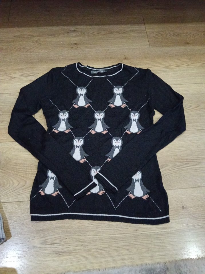 Siyah, uzun kollu ve bisiklet yaka örgü kazak. Penguen desenleriyle rahat ve gotik tarzda, günlük kullanım için uygundur.