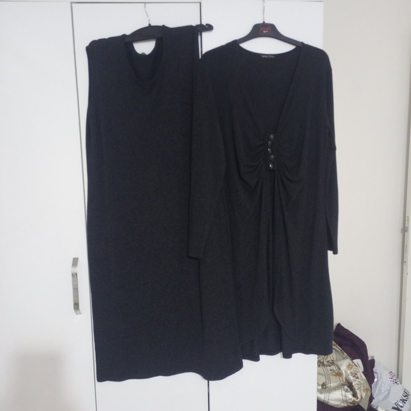 Siyah, uzun kollu, bol kesim ve drapeli V yaka örme elbise, ipeksi kumaştan yapılmıştır. Gotik tarzda şık bir parça.