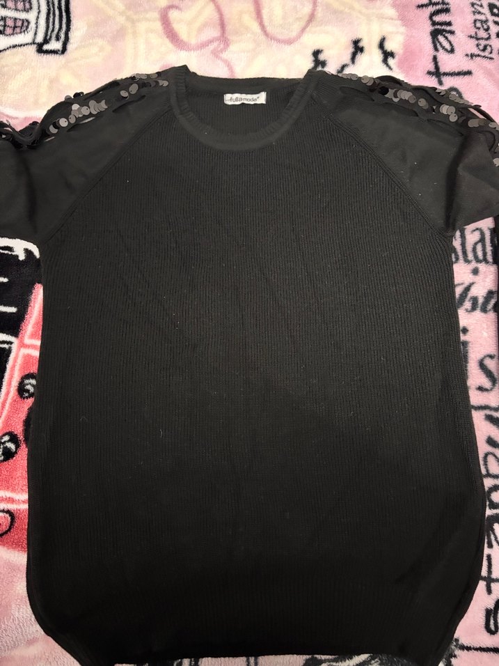 Siyah, uzun kollu, yuvarlak yaka ve örme detaylı kadın kazak. Normal midi boyda, goth tarzında ve günlük kullanıma uygun.