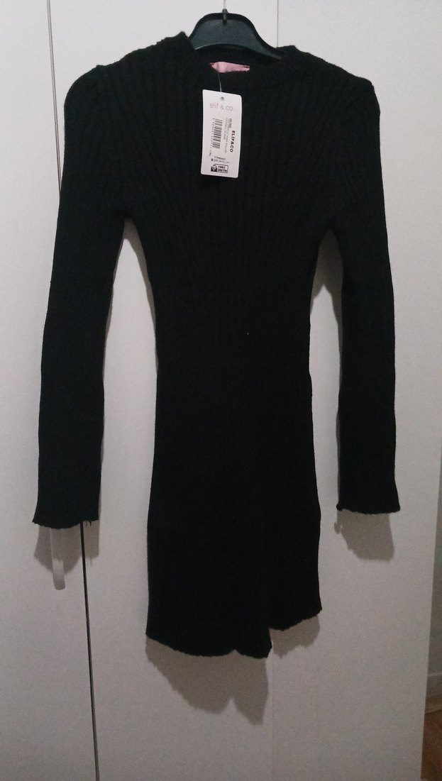 Siyah renkli, uzun kollu ve yüksek yakalı örme midi elbise, vücuda oturan kesimiyle konforlu ve şık bir goth tarzı sunar. Günlük kullanıma uygundur.