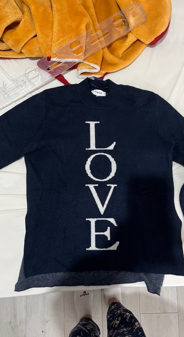 Siyah uzun kollu pamuklu triko kazak, bol kesim ve yuvarlak yaka ile, örgü dokusu ve dikey 'LOVE' baskısı bulunur, rahat sokak stili için uygundur.