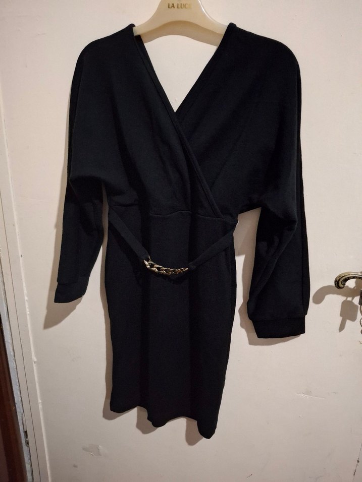 Dar kesim siyah elbise, uzun kollu ve yılan desenli detaylarla Parisian sokak modasını yansıtıyor. Strappy kemer ve LALUC markalıdır.