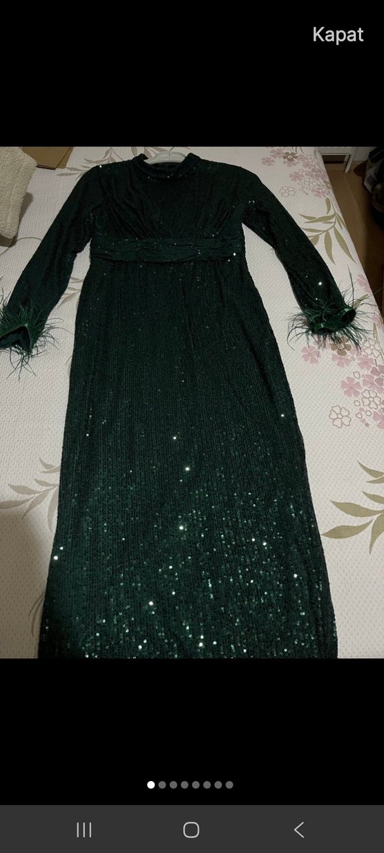 Siyah, uzun kollu abiye elbise yüksek yakalı ve sim detaylı hafif batik desenlidir. Düzenli kesimiyle mütevazı ve göz alıcı parti stilleri için uygundur. ✨ sadece bir kere giydim