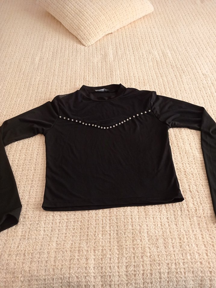 siyah, uzun kollu, yüksek yakalı ve göğüs kısmında payetli detaylara sahip, sentetik kumaştan yapılmış dar kesim bluz. krop diye de geçiyor kategori doğru çıkmıyor kadın kategori L beden
