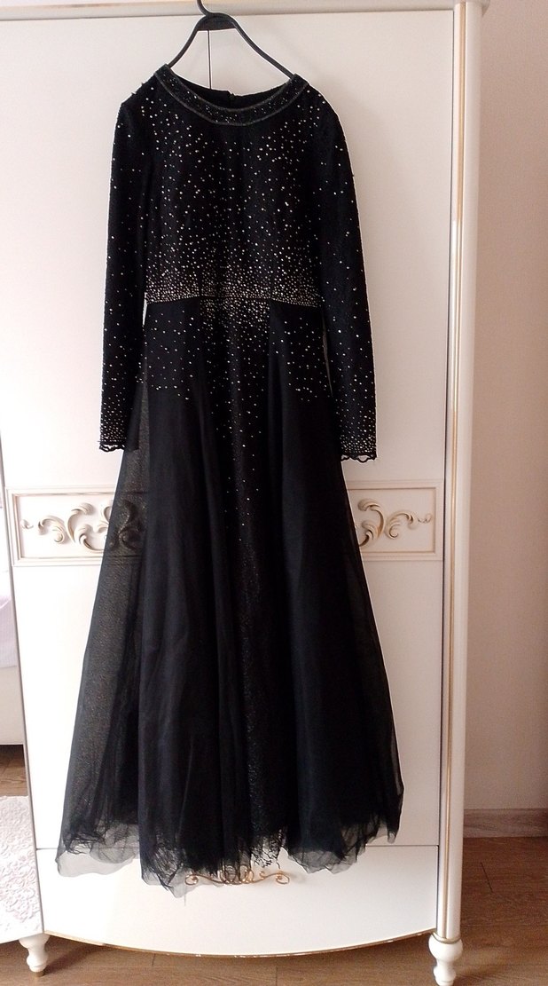 Siyah uzun kollu, yüksek yakalı ve payet detaylı bu dar kesim abiye elbise uzun boyu ve gotik tarzıyla düğünlere uygundur.