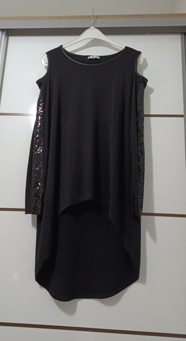 Siyah, uzun kollu, yuvarlak yakalı ve bol kesimli arka tarafı uzun tunik, deri detaylar ve kollarda payet süslemeleri ile günlük kullanıma uygun gotik tarzda.marka temsili beden ş yazıyor ama 40 bedenede uyar. Çok az kullanılan sıfırdan farksız triko tunik