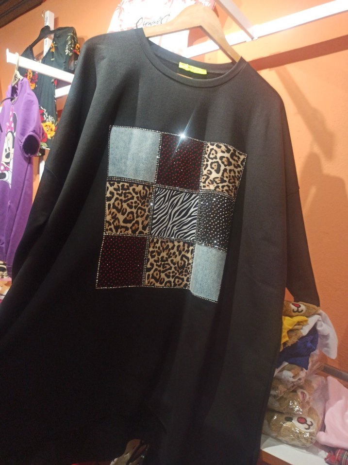 Siyah uzun kollu, salaş kesim kadın sweet. Ön tarafında payetli, hayvan desenli ve dokulu patch detayları bulunan desenli tasarım. Uzun boy ve tekstil kumaş kullanılmış. boy uzunluk 80.cm 48 bedene kadar cok rahatlıkla olur oversize