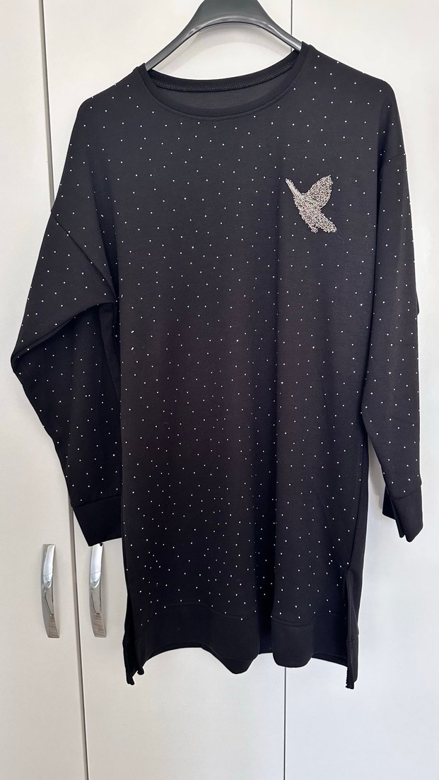 Siyah, uzun kollu, yuvarlak yakalı bol kesim tunik, payetli kuş detayı ve küçük baskılı noktalarla, sentetik kumaştan üretilmiştir. 40 beden
