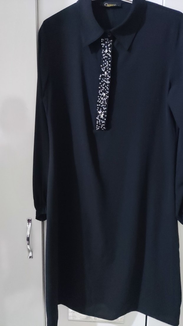 Siyah uzun kollu elbise, yakalı ve payet işlemeli detaylara sahip. Regular fit ve sentetik kumaştan, ofis için uygun minimal goth tarzında modest bir model.