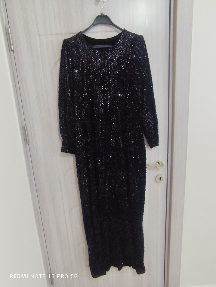 Fitted kesim, uzun kollu ve yuvarlak yakalı siyah payetli uzun abiye elbise, partiler için uygundur. ✨