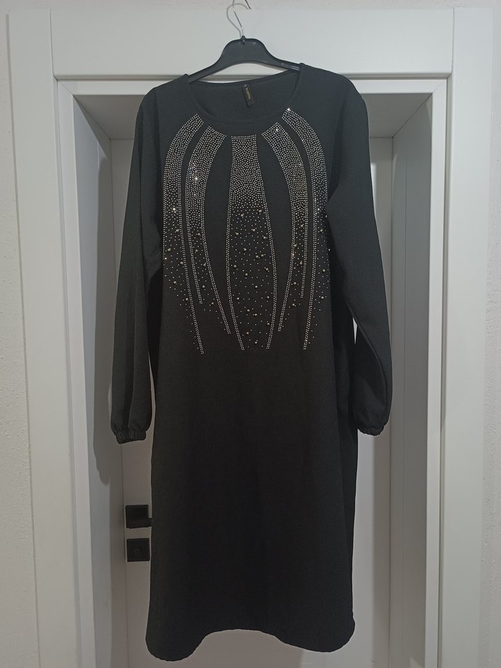 Yuvarlak yakalı, uzun kollu ve bol kesim siyah uzun elbise. Payetli nakış detayları ile gotik ve sade bir tarz sunar.✨ 50 52 beden yazıyor