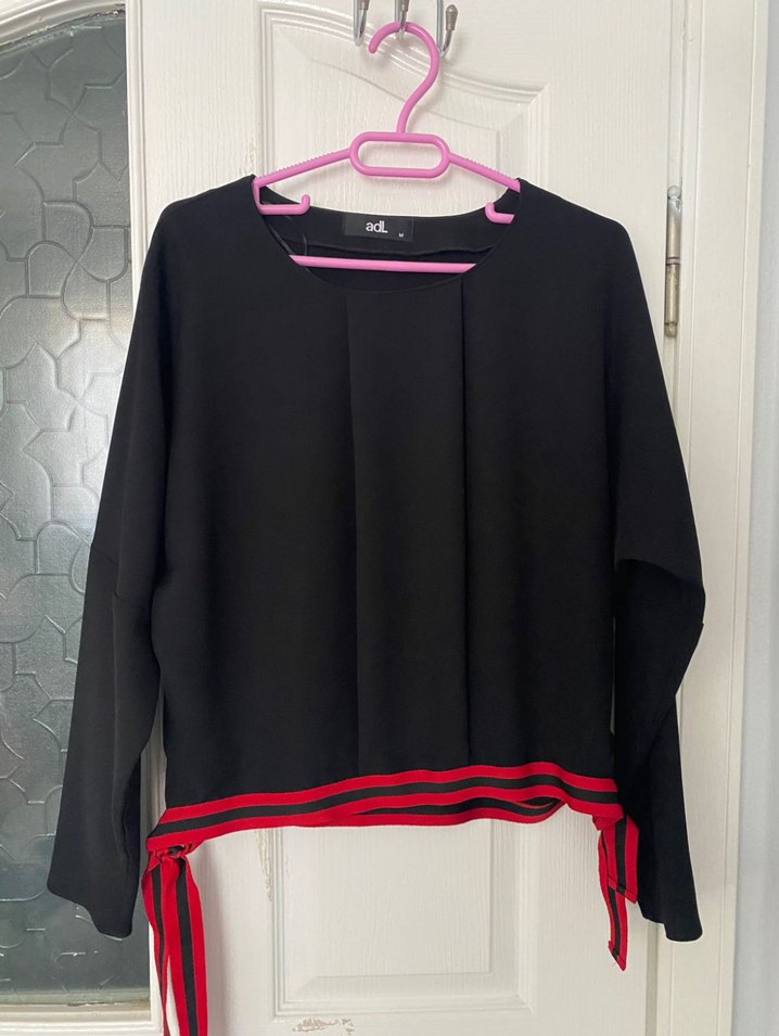 Siyah, uzun kollu, yuvarlak yaka ve pilili detaylı bluz. Sentetik kumaştan, bol kesim ve midi boyda, günlük rahat stil için uygun.