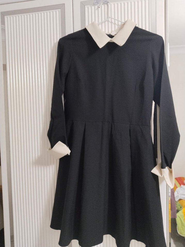 Siyah boy, yakalı ve uzun kollu elbise. Pilili detaylara ve klasik zarafetle goth Paris tarzını yansıtan düzenli kesime sahiptir. Ofis kullanımı için uygundur.