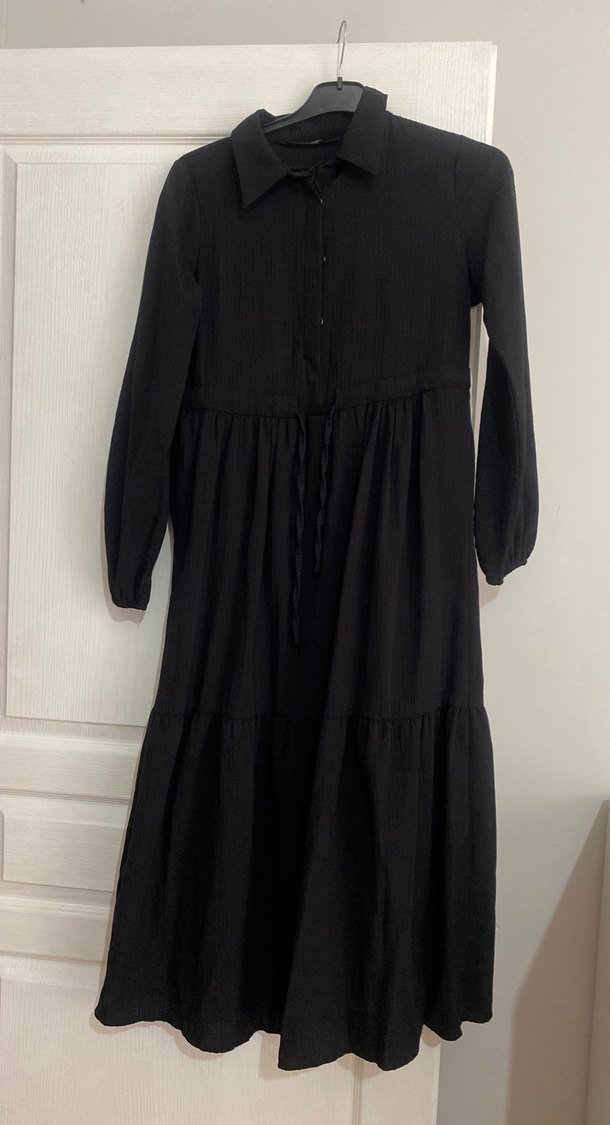 Keten kumaştan, uzun kollu, yakalı, pilili siyah elbise. Minimalist goth tarzında ve uzun boydadır.