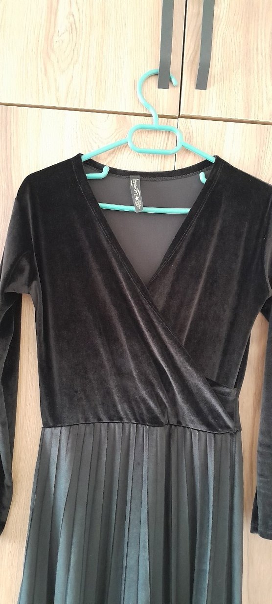 V yaka ve pilili etek detaylı, uzun kollu, siyah, kadife kumaştan yapılmış, vücuda oturan gotik tarzda elbise. Romantik akşamlar için uygun.