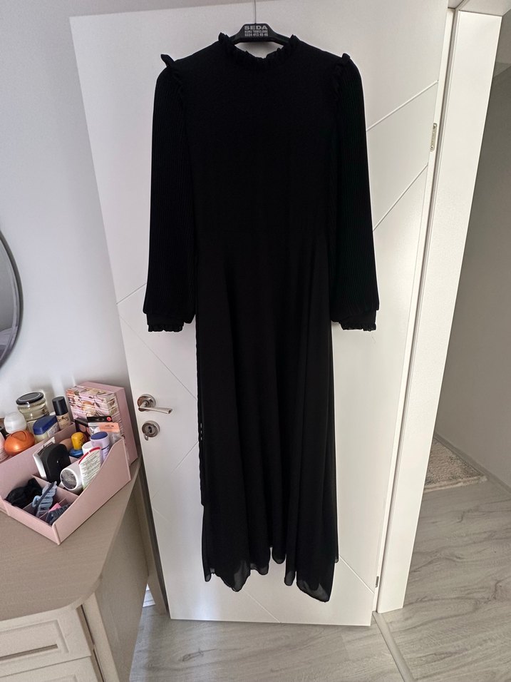 Yüksek yakalı, piliseli siyah uzun kollu elbise.