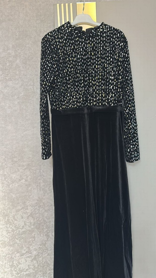 Sentetik kumaştan yapılmış, uzun kollu ve yüksek yakalı siyah piliseli elbise. Rahat kesimiyle ofis kullanımı için uygundur, gotik ve rahat tarzda. halamın abiyesi deformesi yok