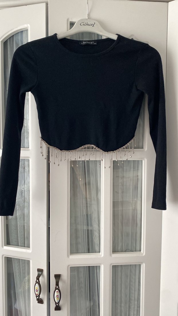 Siyah uzun kollu, dar kesim crop top. Etek kısmında payetli püskül detayları bulunur, günlük şıklık için uygundur. ✨