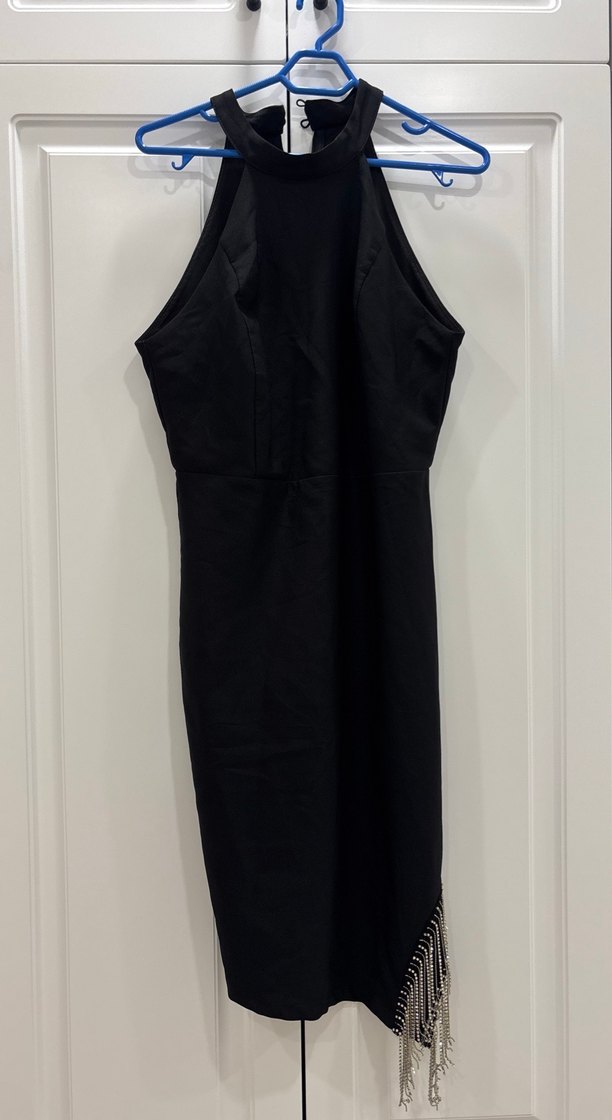 Siyah, yüksek yakalı ve kolsuz, vücuda oturan uzun elbise, etek kısmında püskül detaylarıyla gotik tarzda şık bir seçim.
