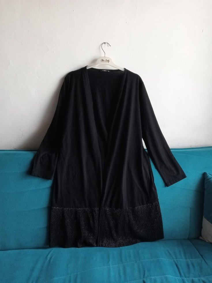 Siyah, uzun kollu, rahat kesim ve uzun boylu kadın hırkası, sade ve gotik tarzda, konforlu bir yapıya sahiptir.