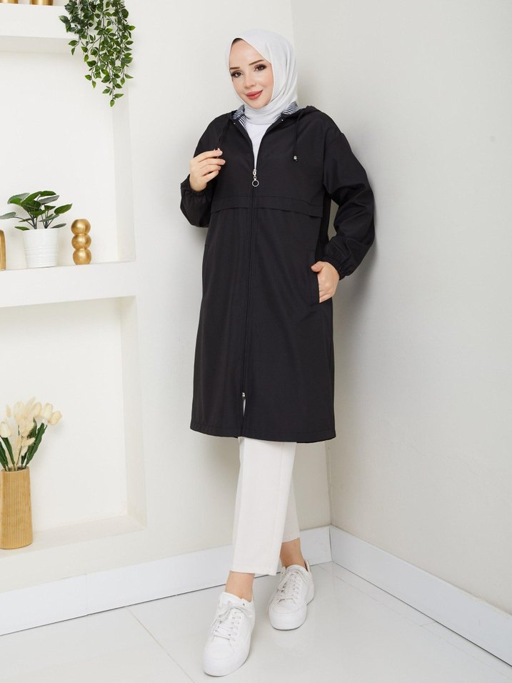Siyah uzun kesim, bol kesim ve uzun kollu sentetik kumaştan yapılmış, yakalı kadın yağmurluğu. Günlük kullanıma uygun, zahmetsiz şıklık sunar. ️