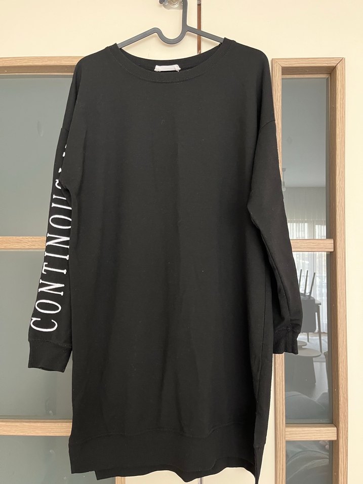 Siyah pamuklu tunik, uzun kollu ve yuvarlak yakalıdır. Kolundaki baskı detayıyla rahat ve şık bir günlük tercih sunar.