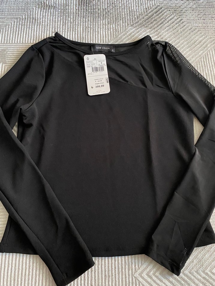 Siyah uzun kollu, bisiklet yaka ve vücuda oturan kesime sahip sentetik kumaş bluz. Baskılı detay ve günlük kullanıma uygun şık, rahat tasarım.