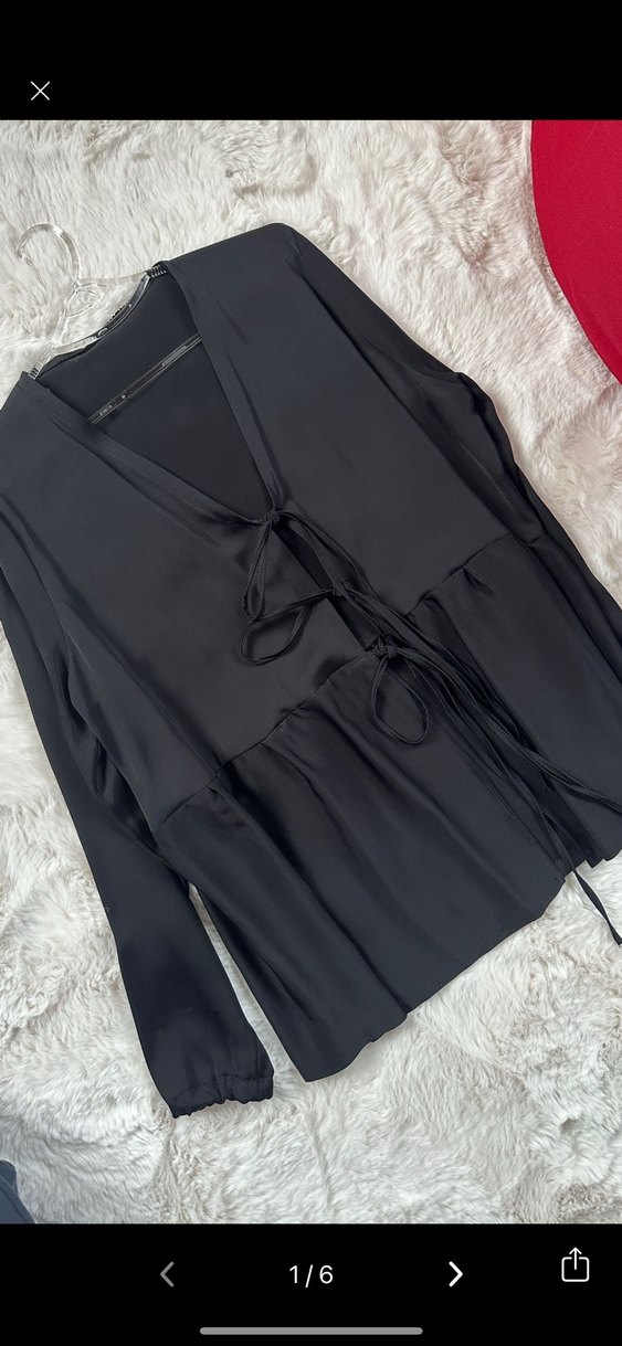 Bu salaş bluzu, ipeksi kumaş, V yakalı ve uzun kolludur. Koyu ve desensiz tasarımıyla ofis için şık ve rahat bir görünüm sunar.36-38 hatta 40 bedene kadar olur. Hiç kullanılmadı. Şık bir ürün