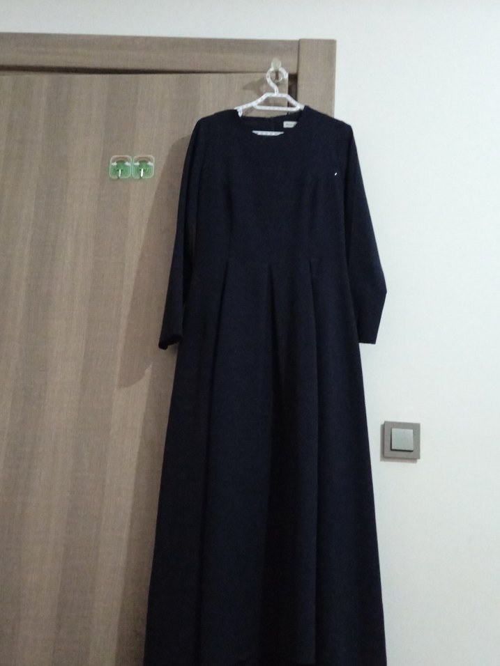Siyah uzun kollu, salaş kesim ve drapeli detaylara sahip elbise. Düz, sentetik kumaştan üretilmiş, sade ve mütevazı tarz için uygundur.
