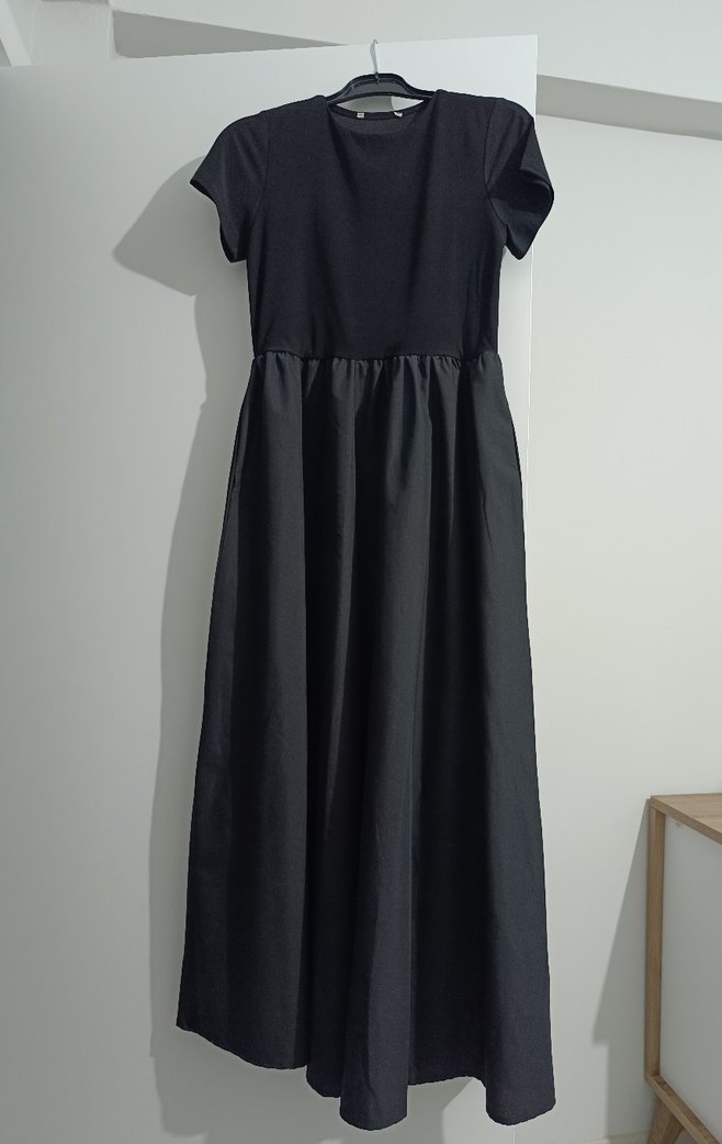 Siyah uzun elbise, kısa kollu ve salaş kesimlidir. Düz, sentetik kumaştan yapılmıştır. Minimalist, normcore tarzıyla günlük kullanıma uygundur.